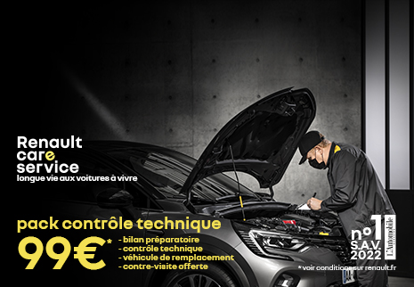 *Ce prix conseillé comprend le bilan préparatoire, le contrôle technique, le véhicule de remplacement et la contre-visite offerte. Le bilan préparatoire comprend les points de contrôle suivants et la main-d’œuvre associée : les éclairages intérieur/extérieur, la visibilité, le compartiment moteur, l’habitacle, les pneumatiques, le diagnostic des calculateurs, le freinage, la direction, liaison au sol et le sous-caisse. Le contrôle technique sera effectué dans un centre de contrôle agréé. Le véhicule de remplacement est mis à disposition par l’établissement désigné au jour de la réalisation de l’offre contrôle technique à 99 €, sous réserve de disponibilité locale. En cas de non disponibilité d’un véhicule de remplacement, aucune compensation financière ni aucun dédommagement ne pourra être exigé. Offre non cumulable avec les opérations de même nature en cours, réservée aux particuliers sur les véhicules toutes marques, hors véhicules de PTAC > à 3,5 t, hors véhicules utilitaires modifiés, hors véhicules GPL, hors véhicules électriques et hors véhicules hybrides.